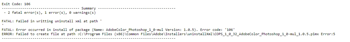 Exit Code: 106 -------------------------------------- Summary -------------------------------------- - 2 fatal error(s), 1 error(s), 0 warnings(s) FATAL: Failed in writting uninstall xml at path ' ' FATAL: Error occurred in install of package (Name: AdobeColor_Photoshop_1_0-mul Version: 1.0.5). Error code: '106' ERROR: Failed to create file at path :C:\Program Files (x86)\Common Files\Adobe\Installers\uninstallXml\COPS_1_0_32_AdobeColor_Photoshop_1_0-mul_1.0.5.pimx Error:5 -------------------------------------------------------------------------------------