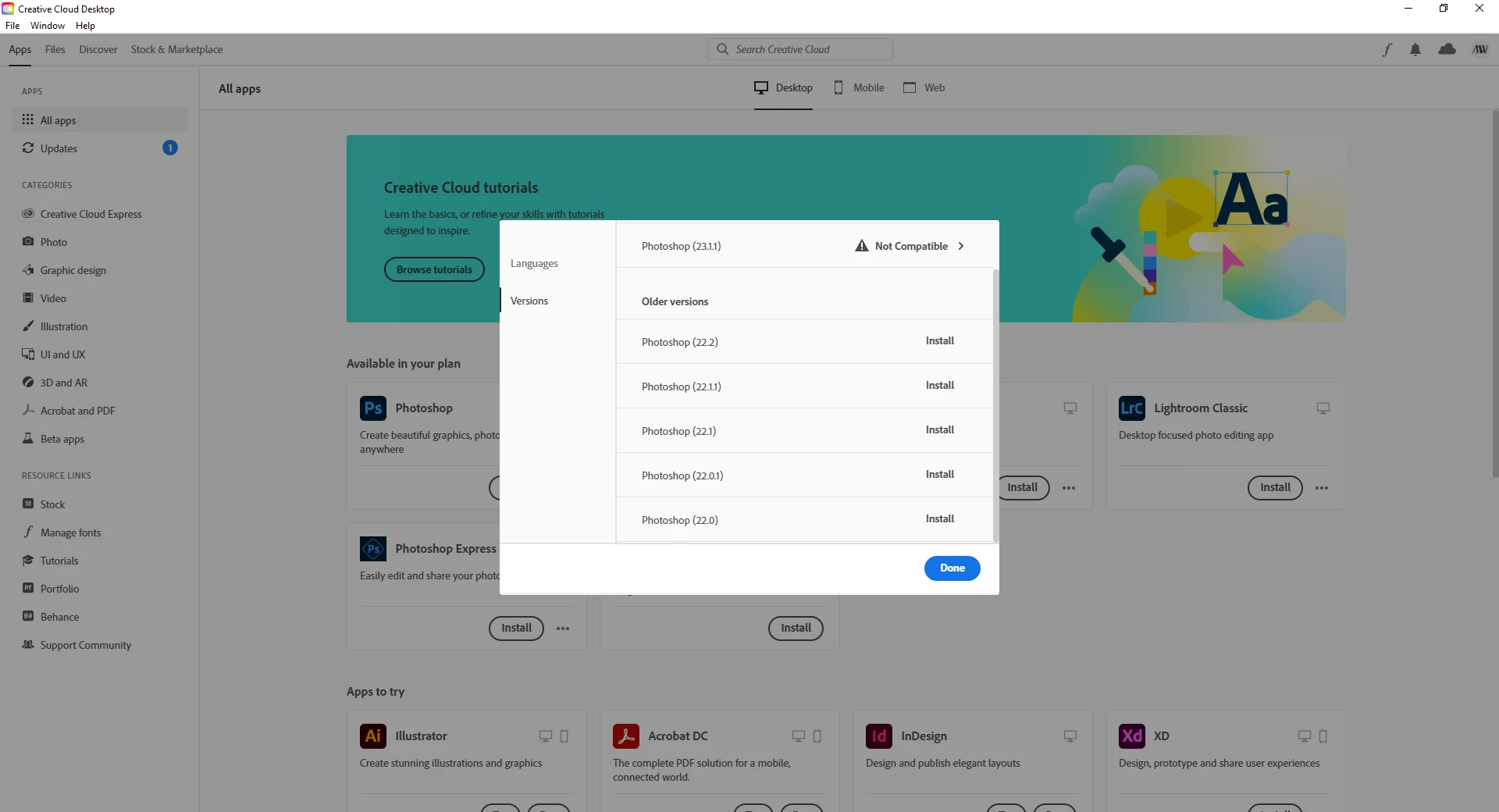 It seams that i was to quick to celebrate my new acquisition. Creative cloud gave me 1 option to install Photoshop 22.2 (compatible, Photoshop 23.11 is not compatible). I've installed the version provided but when i tried to open it gave an error ("Error at loading of ippCV library"). It's my bad that i did not check the fine print regarding system requirements, so my Phenom 1100T (6 core) is good but it's missing SSE 4.2 and above. But then why did Creative Cloud gave me the option to install an older version, there was no incompatibility message (like the one from version 23.11) so i took it to face value.