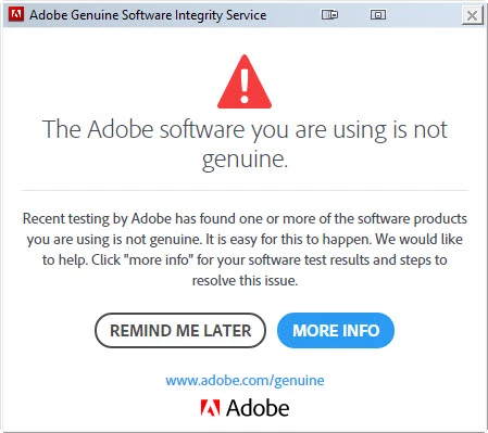 Hi, I started getting alerts every 15 seconds yesterday at work about my adobe software not being genuine. It's completely distracting.