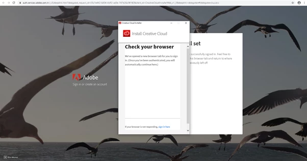 When I started the installation of CC Adobe I recieve the information as you see in the picture below. When checking the browser it says that everything is ok and that I can close the browser window. After that nothing happens. What is wrong? What can I do diffrently?