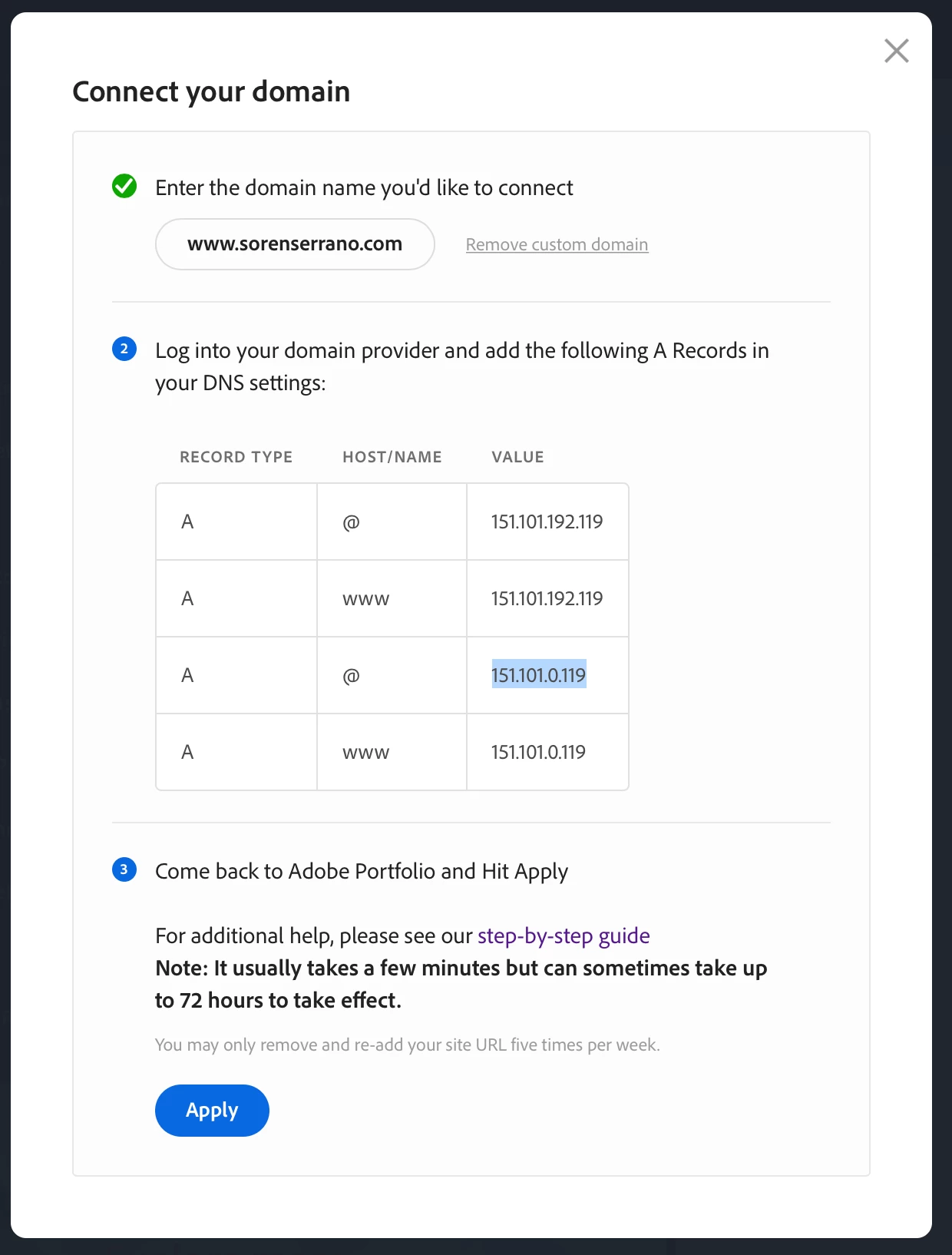 Is two (2) A's sufficient enough to properly link the domain? I read somewhere that other host allow for only two. One for A, and one for CNAME. I haven't click the "Apply". button in Adobe Portfolio as I'm worried that I might break the link somehow. Please help....