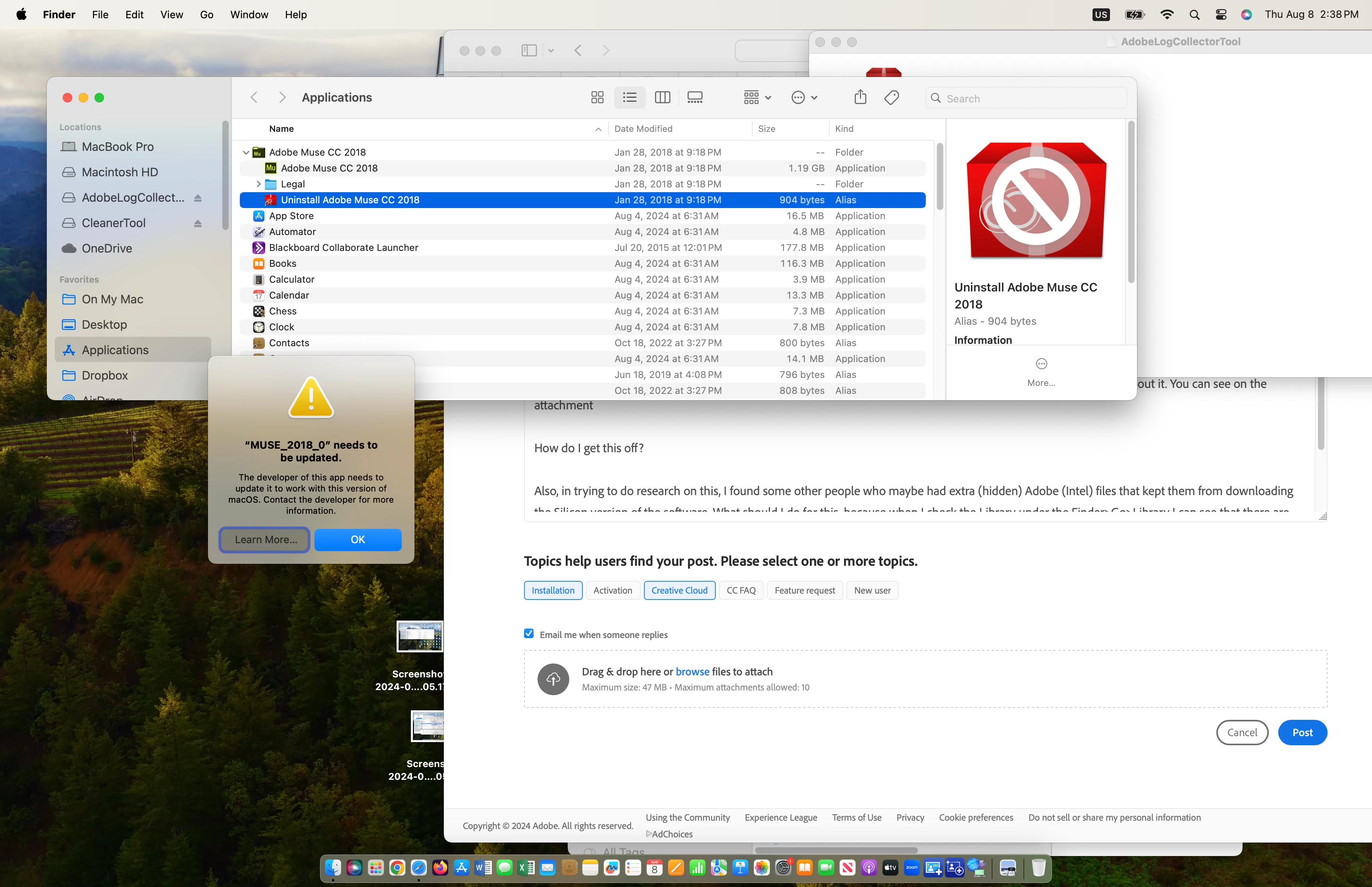 I have Muse CC (2018) on the computer and for the life of me it wont come off, even when I use the cleaner. The Uninstall app is red and asks for an update, which of course it cannot do. Annoyingly, I never really used it, I downloaded it to try it out and well, forgot about it. You can see on the attachment the message I get when I double click the Uninstall. Press OK, nothing happens...just an acknowledgement. Press Learn More and I get the article posted on the screen shot.