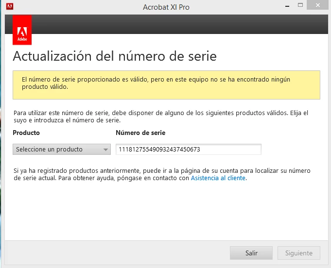 I had an official Acrobat XI Pro installed in a previous computer with Win 8.1 and I have changed the computer for a brand new with Win 8.1 as well. After doing the installation again the system requests to update the license number although it detects that the one I've introduced at the beggining is valid. However, in the screen where it requests to write the license number, there is no an option for Acrobat XI Pro. I don't know how to finish the installation.