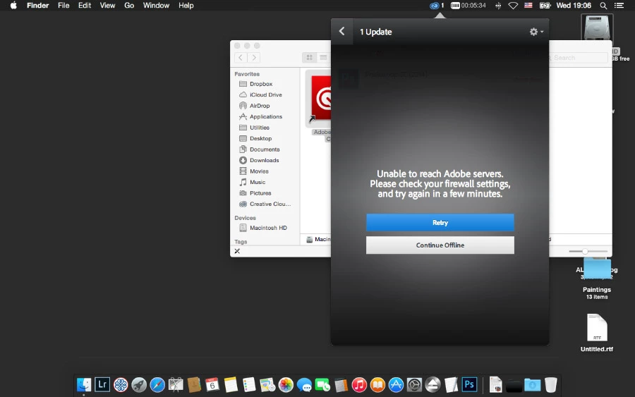 I downloaded Creative Cloud App, sign in with my Adobe ID, checked at CC web site my status that my plan is active and start downloading and installing Photoshop and Lightroom. Both programs were installed and infront of each soft appeared a button Update. But when I pressed the Update button, I got an Error message: "Unable to reach Adobe servers/ Please check your firewall settings and try again in a few minutes.