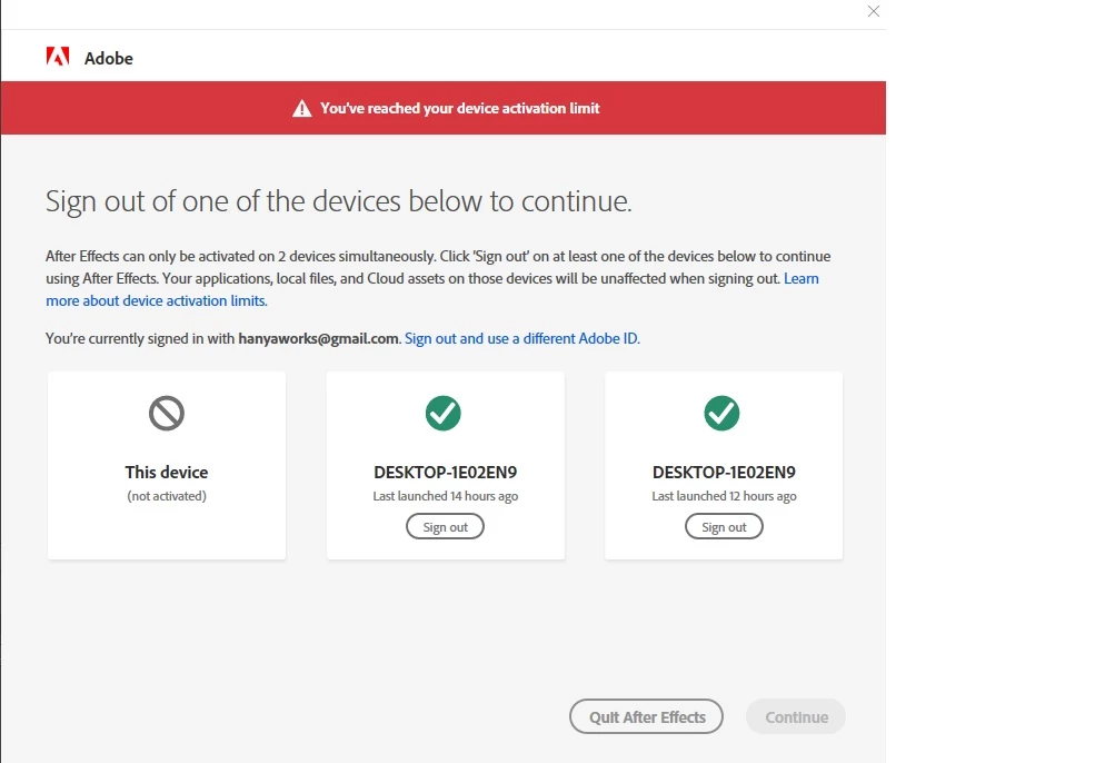 As you can see Adobe products see that I am login to 2 PCs if we look closer you will find it's that same PC but still I have to logout from one of them, that's a bit funny for me but anyone can help to help this problem,