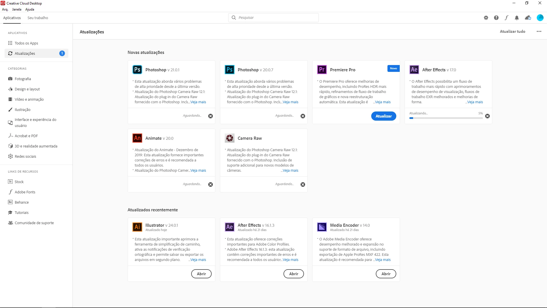 Problemas de atualizações dos produtos da Adobe Creative Cloud