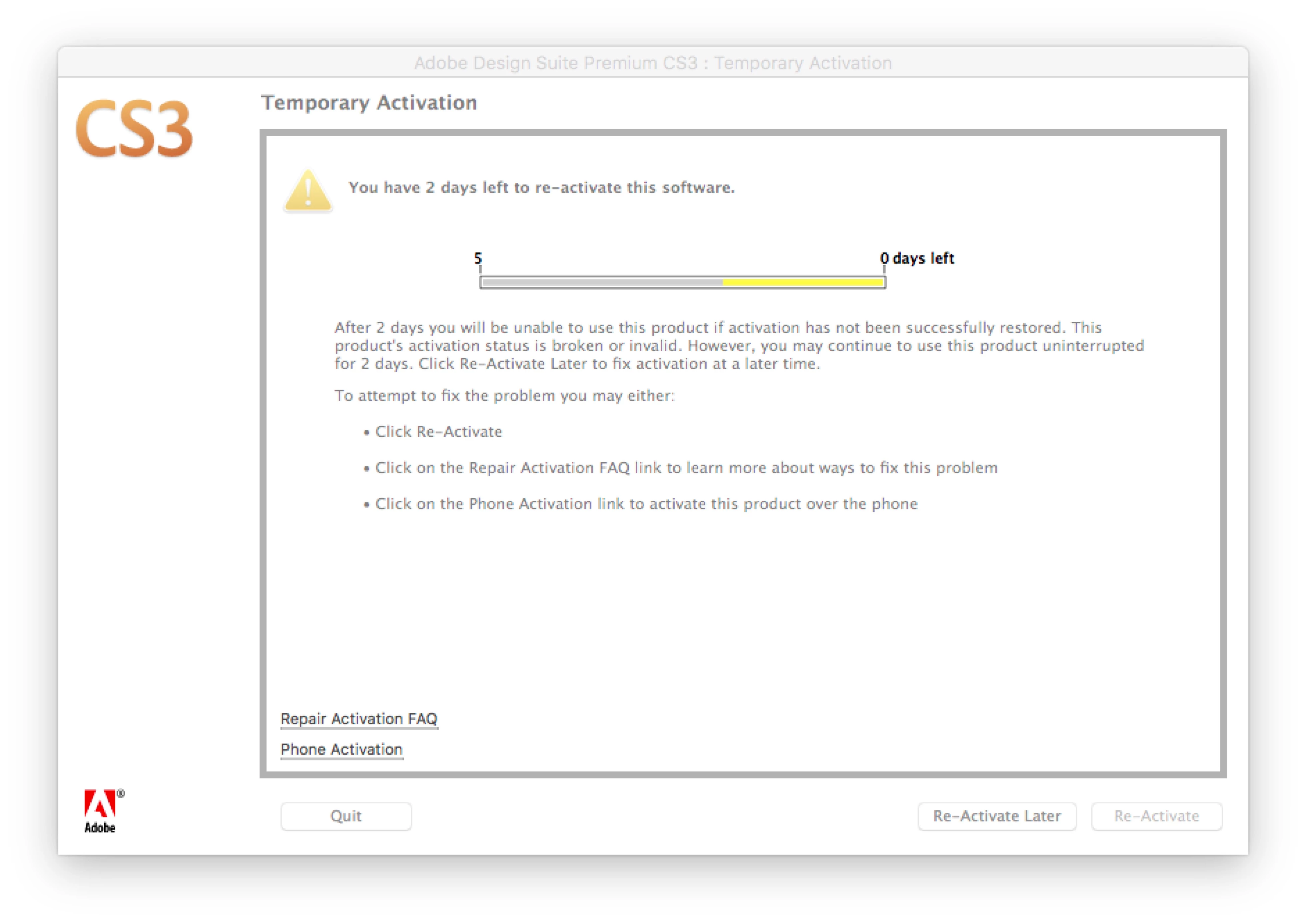 When I tried Repair Activation FAQ in the first screen shot, I got the Adobe web page with instructions on on uninstalling, downloading, etc. which has all been done.