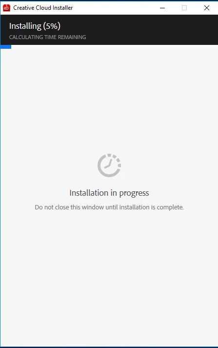 I am also having trouble installing Creative Cloud. Fresh Windows (newly formatted) 10 build and worked perfectly on Windows 8. Download installer from Adobe site but gets to 5% and hangs (see screenshot). Have given it an hour or more but never moves. Followed above procedure, but only change is it now asks me to login first.