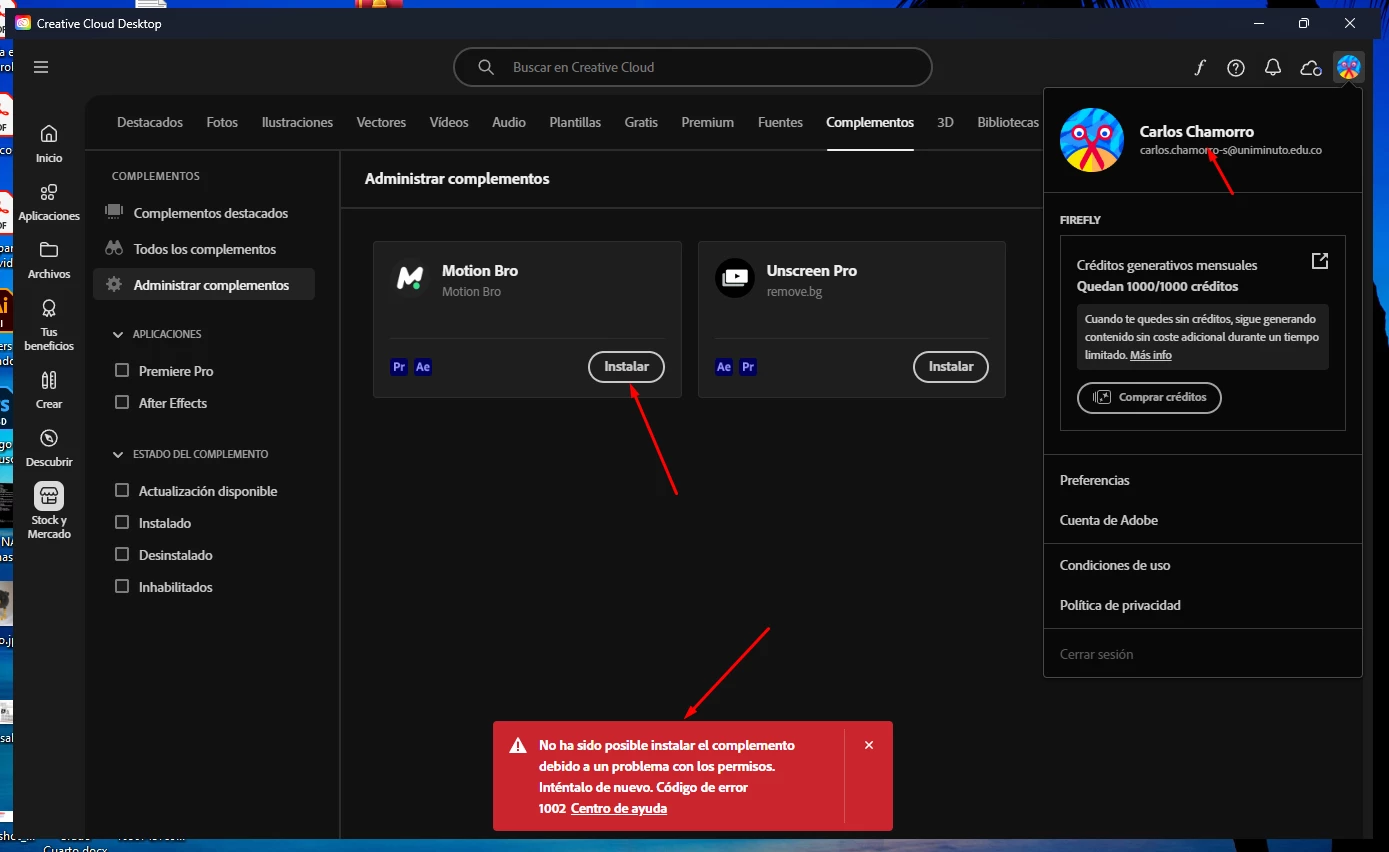 Sinceramente me parece absolutamente RIDICULO este problema. yo en mi caso estoy intentando instalar unos complementos DISPONIBLES EN LA SECCIÓN DE STOCK Y MERCADO de la misma app. me dice que me aparecerá un mensaje donde debo confirmar mis datos de loguin pero NUNCA APARECE ya desinstalé todo y volví a instalar y para las apps (premiere, after, photoshop) funciona perfectamente pero para complementos me sale este error. ESTO ES RESPONSABILIDAD DE ADOBE Y SUS ESTÚPIDOS PROTOCOLOS DE SEGURIDAD es un error de la aplicación y exijo que sea corregido de inmediato pues estoy tratando de trabajar y necesito estos complementos. me parece INDIGNANTE que tantas personas estén tendiendo el mismo problema y la respuesta sea tan MEDIOCRE como "REINSTALE" Pero no surta efecto y no genere solución.