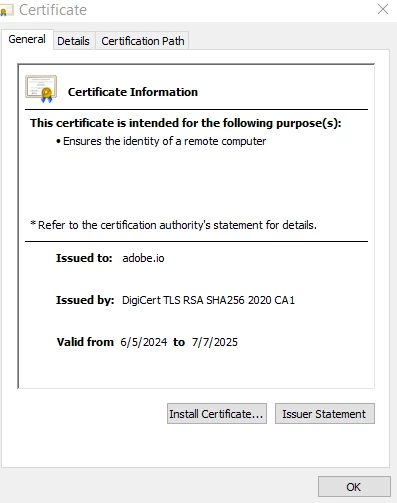 All my apps and programs are up to date and secured with paid anti-malware. The certificate points to adobe.io - thought you'd like to know. Thanks