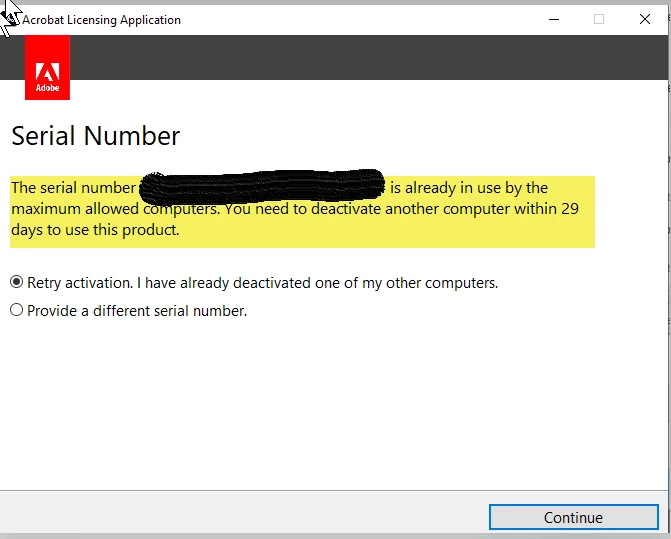 I run Acrobat on my work laptop and PC. For some reason, after I formatted my PC and tried to install Acrobat again it says The serial number XXX_XXX_XXX_XXX is already in use by the maximum allowed computers. You need to deactivate another computer within 29 days to use this product.