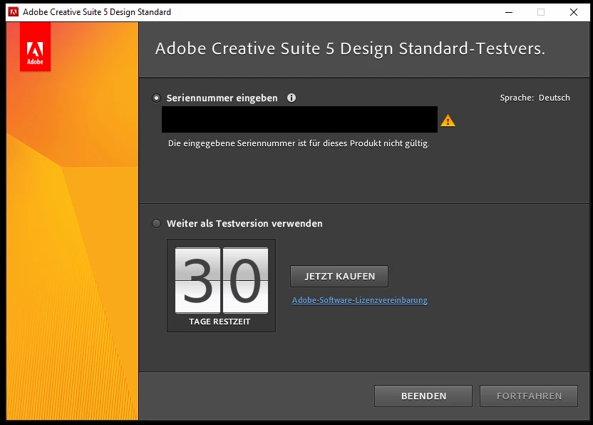 Beim aktivieren unserer CS5 wird die Seriennummer als nicht gültig angezeigt.