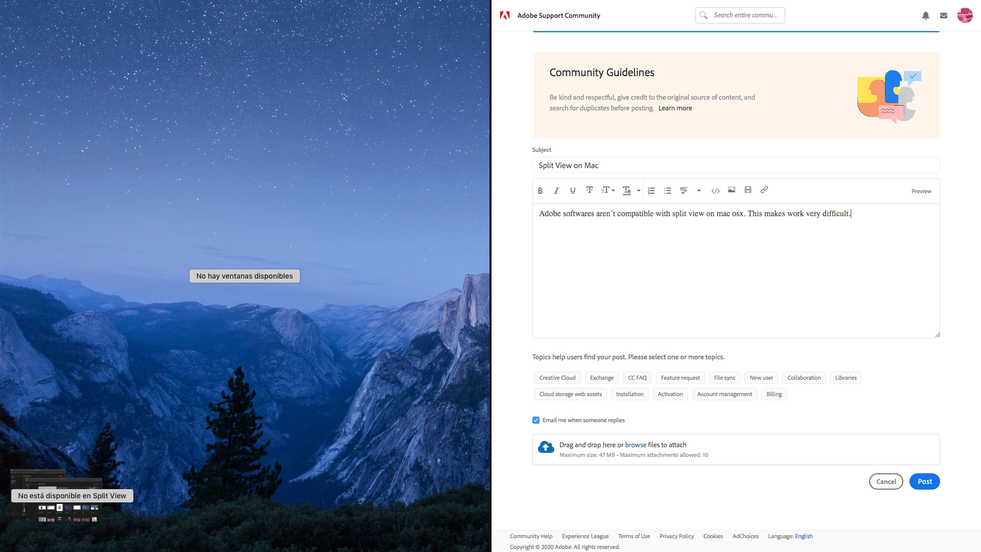 DdvergaraaParticipantForum|Forum|6 years agoApril 6, 2020QuestionSplit View on MacForum|Forum|6 years agoApril 6, 20202 replies553 viewsAdobe softwares aren´t compatible with split view on mac osx. This makes work very difficult.Feature request