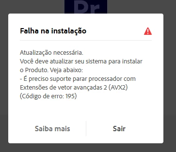 Fiz a compra do conjunto de programas Adobe Creative Pro, e simplesmente não consigo instala-los! Na loja de programas simplesmente aparece a mensagem de erro "Sistema incompativel" por falta de suporte AVX2 no meu processador, e não tenho acesso a download de versões anteriores compativeis!!!!!!