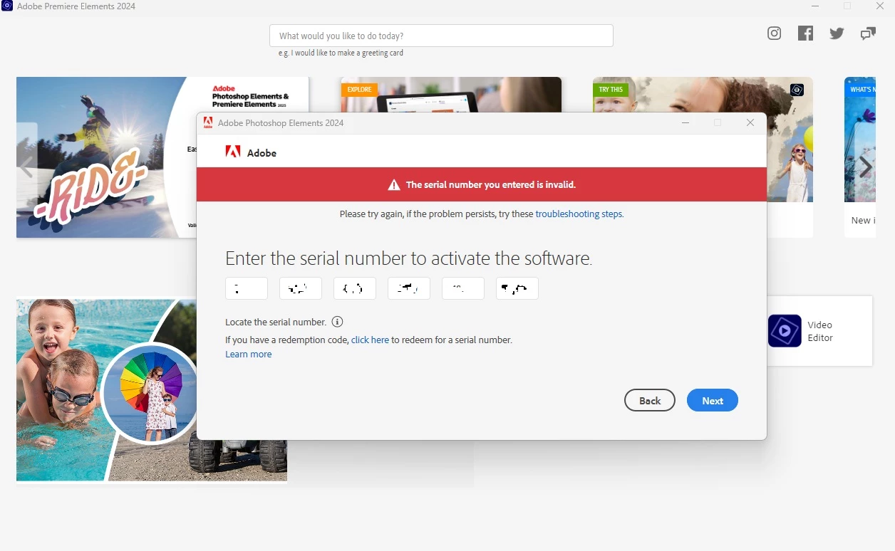 Purchase Premier Elements 24 half a year ago. When I tried to use the program recently I was required to sign on to my account, then asked for a serial number. I provided the one from the "Your products" page (yes I double checked the number) but was told it was invalid. Tried reloading the product and was againg told the number was invalid. Could not find a customer service number, so what am I to do?