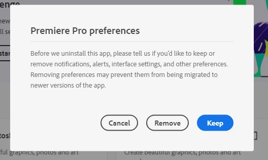 My creative cloud keeps opening on its own saying Premier Pro Keep Settings or Remove, and no matter which i select it wont stop popping up, its very frustrating and annoying, i definitely dont wanna resort to uninstalling creative cloud lol anyone have any suggestions? I recently uninstalled my trial premier pro to make room on my SSD, thanks guys.