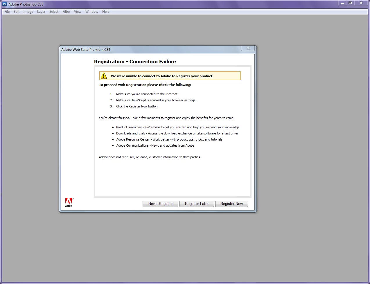 I have also tried a fresh installation of Windows 7. I manually installed CS3 and CS5, both serial numbers were accepted during the installation process, but then as soon as I tried running the software, CS3 reports connection failure and CS5 reports invalid serial numbers.