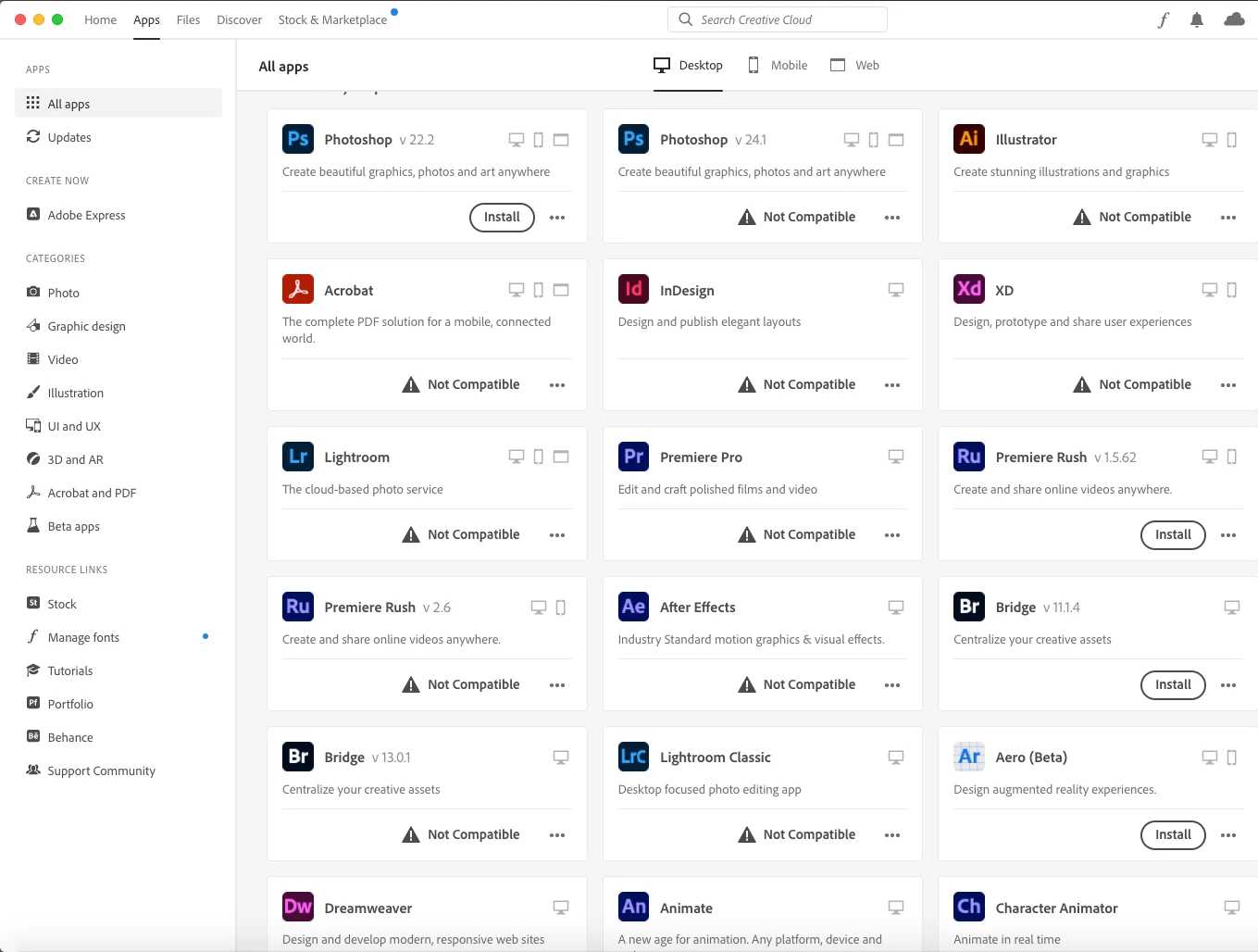 unable to downlaod older versions of Creative Cloud apps on mac os 10.14.6 Mojave