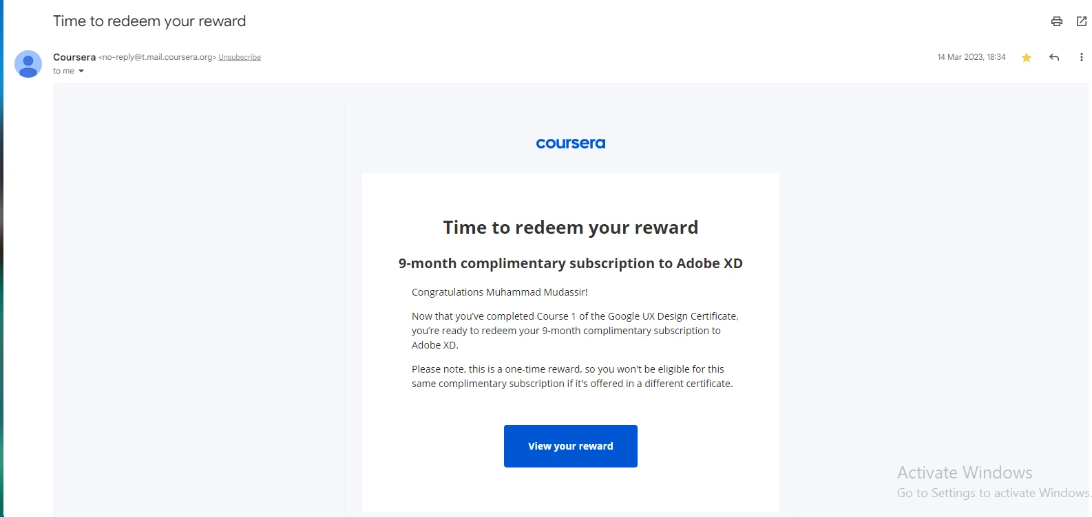 Opened "Claim Your Reward" Email from Coursera