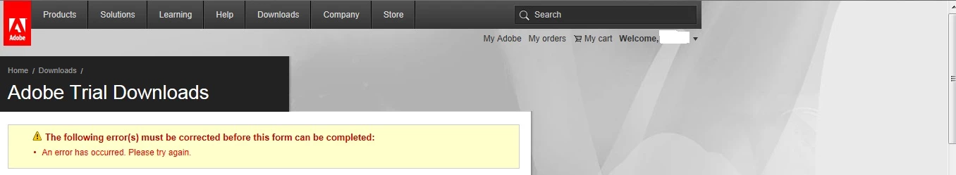 Then I tried to download the trial version from Adobe's website. After I logged in to my account and select the product I want, It showed me a form to fill in the required details and press "continue".