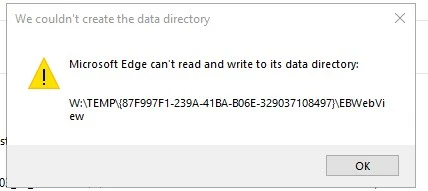 I opened my Creative Cloud app this morning to check for updates and it was unable to show the updates or my programs. I tried closing and reopening three times. Same result. I restarted my computer. Same issue. I uninstalled the Creative Cloud app and downloaded a new installer from Adobe. Now the new download won't install. The message I get reads: Microsoft Edge can't read or write to it's data directory. I guess this is a Microsoft problem and not Adobe. See attachment for error. If anyone has experienced this error please let me know how you corrected the problem. Thanks very much.