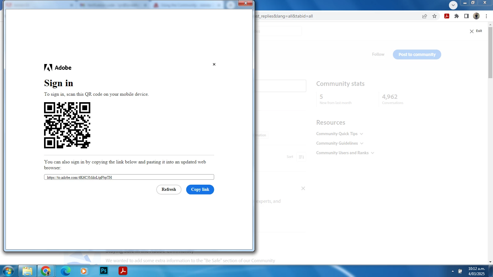 Thanks for posting about your sign-in error to this public discussion forum. Have you tried using Firefox or Edge to complete the sign-in process, LyndaForrest? Please see https://adobe.ly/41o3263 for a list of supported browsers and https://adobe.ly/3QIIhwJ for more information about using QR codes to complete the sign-in process. ^JW