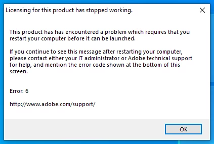 I tried opening CS4 Photoshop and received and Error 6 notification stating licensing for this product has stopped working. I am running Windows 10.