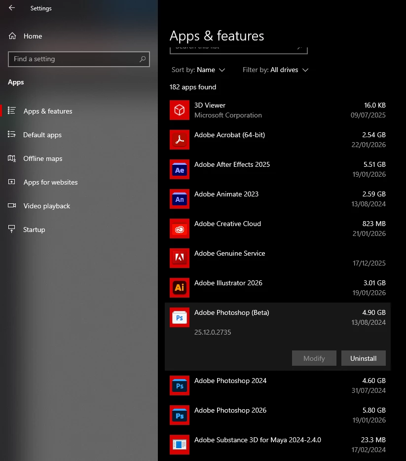 - I’m unable to uninstall certain Adobe apps. Other apps uninstallation worked normally, but for a few, they just can’t be uninstalled and they are still working. It is Adobe Photoshop 2024, Photoshop Beta a Animate 2023. I’v tried it uninstalling them through settings and control panel, always redirected into Creative Cloud Desktop, where I confirned it (tried it with keep and remove option), it shows as unintalling 1% and finishing in matter of like 2 seconds. What really intirates me is the Photoshop Beta. When I want to open for example png through Open WIth, there is only the Photoshop Beta option (from Photoshops) and if I even open it through different app and find the new Photoshop in my PC, it still opens it self through Photoshop Beta. Also the Photoshop Beta already set itself for the second time to be the primarely app for opening psd. I really want to delete it from my computer as soon as possible. But for example in teh Creative Cloud the Photoshop Beta and Animate is showing for me as “Install”.