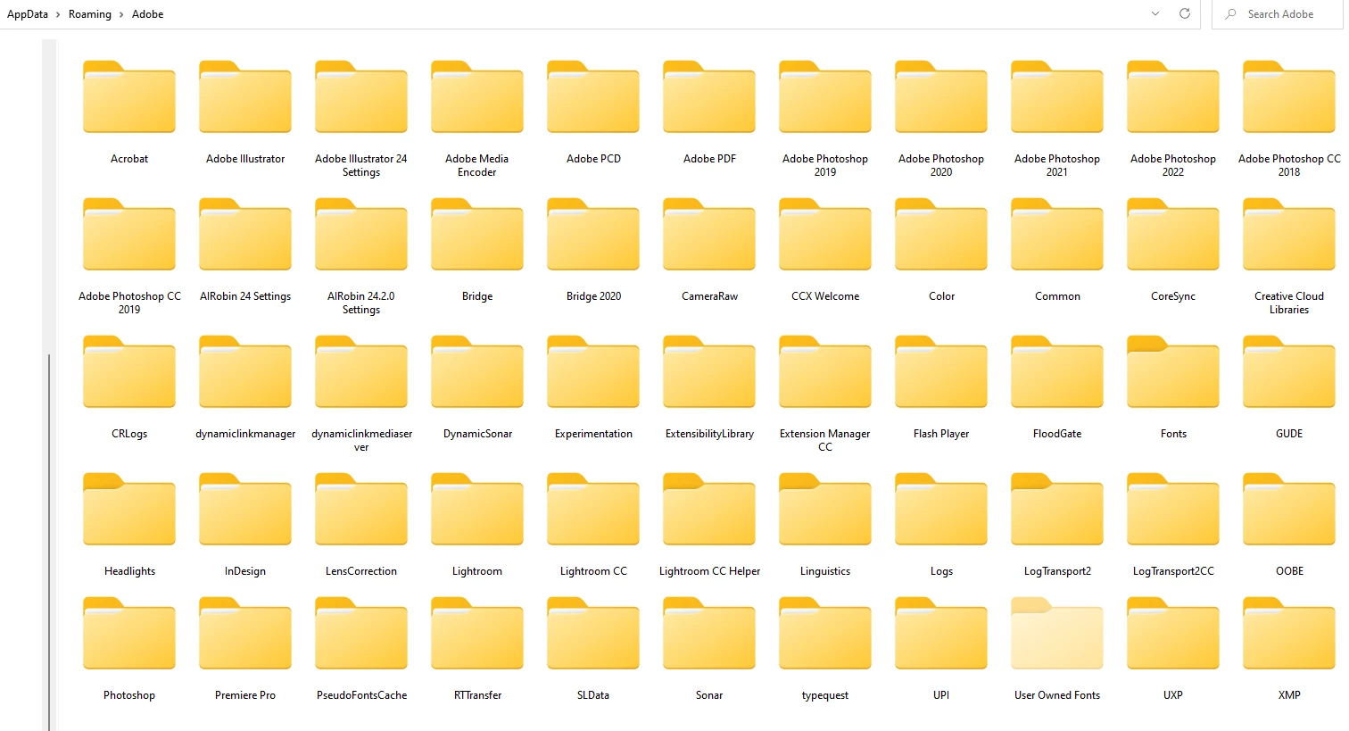 I think that I'm going to have to completely wipe my computer clean of adobe all together, I have no idea what else to do, everytime a new program version comes out, it leaves the old programs on my computer. I try to uninstall programs that I'm not using but I go to my files and they are still there. I'm working in photoshop and lightroom and all of my brushes, libraries, texture patterns... everything is just gone, I have gone through all of the folders that I can and I can't find them anywhere and I didn't uninstall either of those programs, I currently have all versions of Photoshop and Photoshop cc on my computer all the way back from 2018, and I've never used just Photoshop... It's bad enough that my photos take up so much room, but now I have adobe hogging up a ton of space as well. I tried to redownload some of my texture patterns for a project that I'm working on but I can't find them now... If someone can access my computer remotely to try to help me clean up this mess I would greatly appreciate it, I'm far from a computer tech and I really don't want to mess anything up!! I added a screen shot of all of the folders that I have, but these are just the main folders, there are hundreds of folders inside of these.