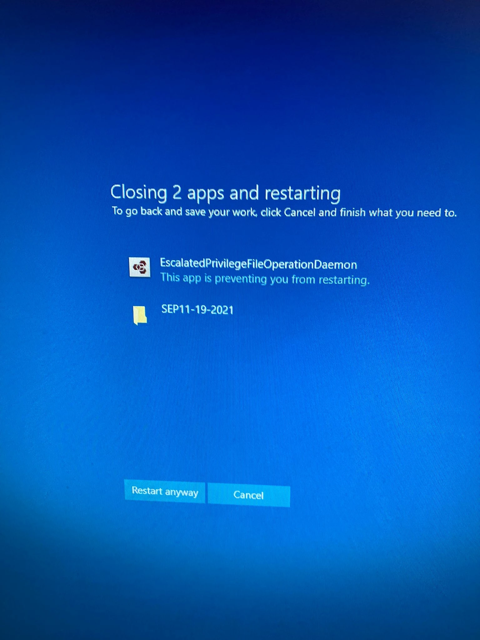 Today I was restarting my computer running Windows 10 Pro Version 10.0.19042 Build 19042 when an app named Escalated Privilege File Operation Daemon prevented me from doing so.