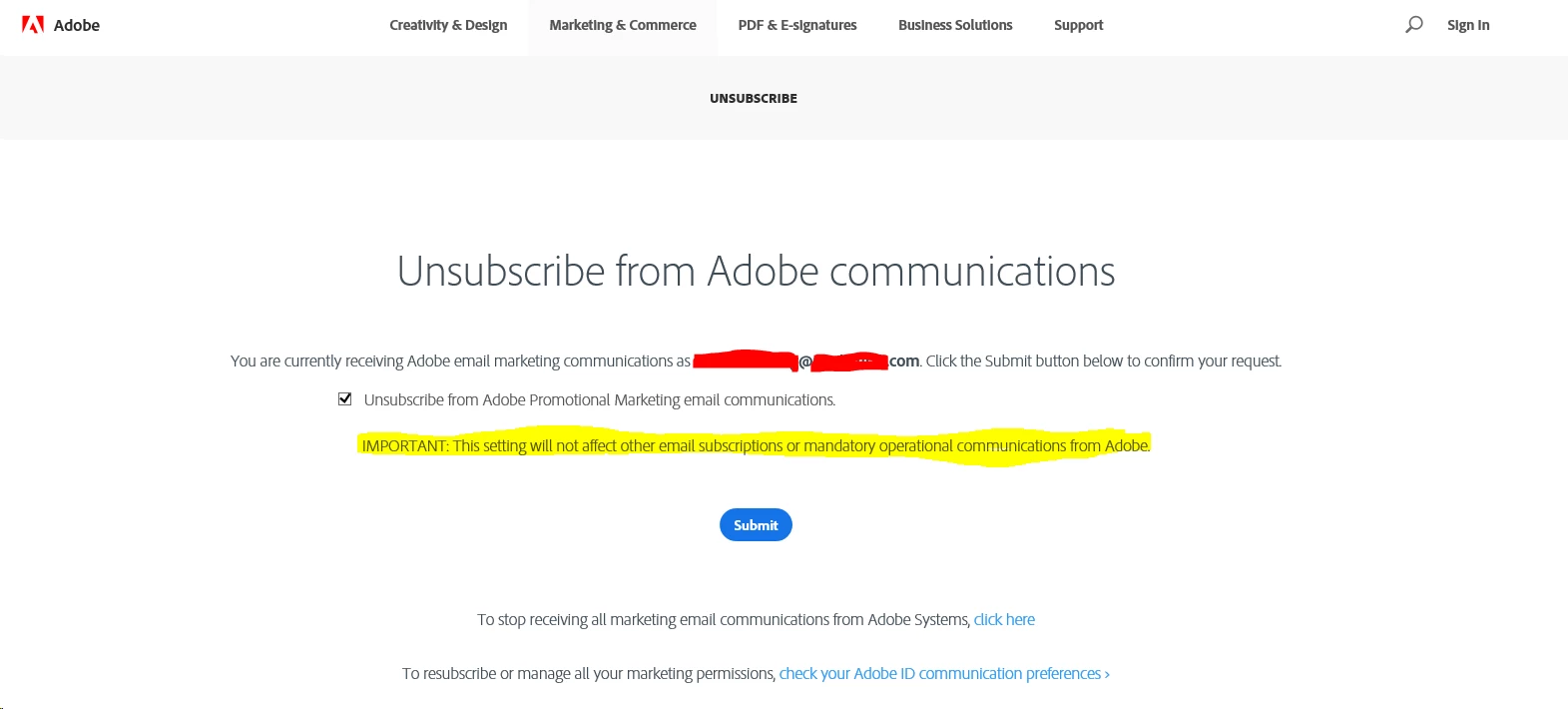I have tried to "Unsubscribe" for days using the link in the (unasked for) Adobe emails I've been getting. Yet each time, instead of getting a confirmation, I end up on a page that's clearly just some random Adobe page. And sure enough, I'm still getting the (unasked for) emails again the next day.