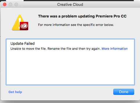 I am trying to do a simple update and I am getting this error along with a note to "rename folder"?? Exit Code: 146 -------------------------------------- Summary -------------------------------------- - 2 fatal error(s), 0 error(s), 1 warnings(s) FATAL: Error (Code = 146) executing in command 'MoveDirectoryCommand' for package: 'AdobePremierePro12AllTrial', version:12.0.1.69 FATAL: Error occurred in install of package (Name: AdobePremierePro12AllTrial Version: 12.0.1.69). Error code: '146' WARN: Failed to move directory '/.adobeTemp/D900B40F-51F3-43E4-A4E7-84940E5AEE58/1/universal/App' to '/System/Library/Components/PDFImporter.component/Adobe Premiere Pro CC 2018' -------------------------------------------------------------------------------------