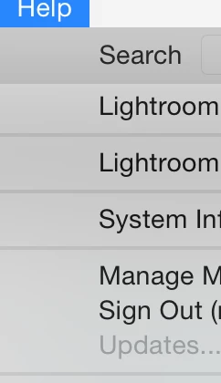 In LR 6.0, I am signed into the account to which the PP LR6 license is attached, however the 'Help -> Updates...' word is greyed out (see pic)