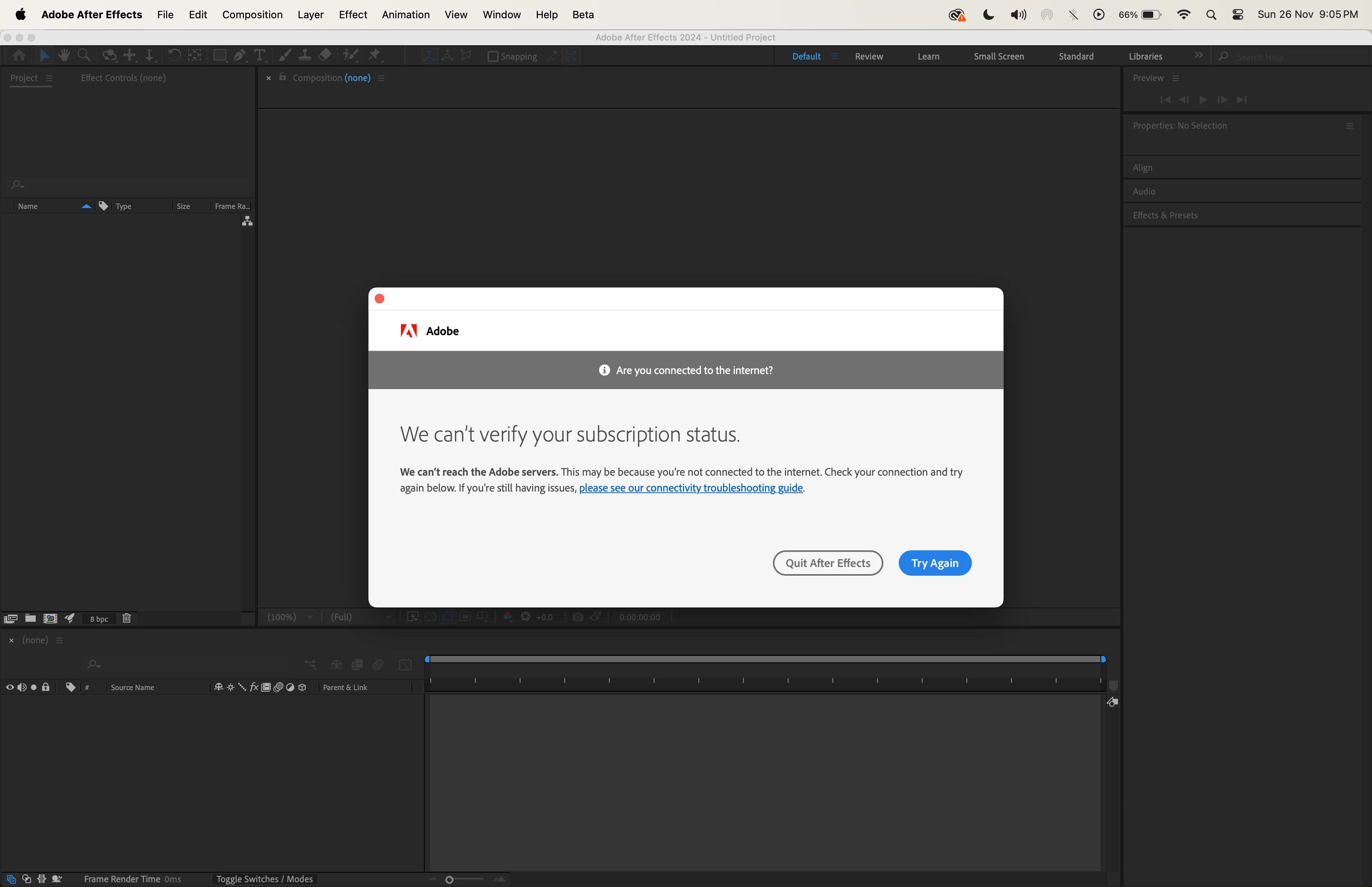 Hi, I have macbook pro M2. Macos Sonoma. On opening after effects app i'm getting error saying We can't verify your subscription status. How do i resolve this problem?. Please help