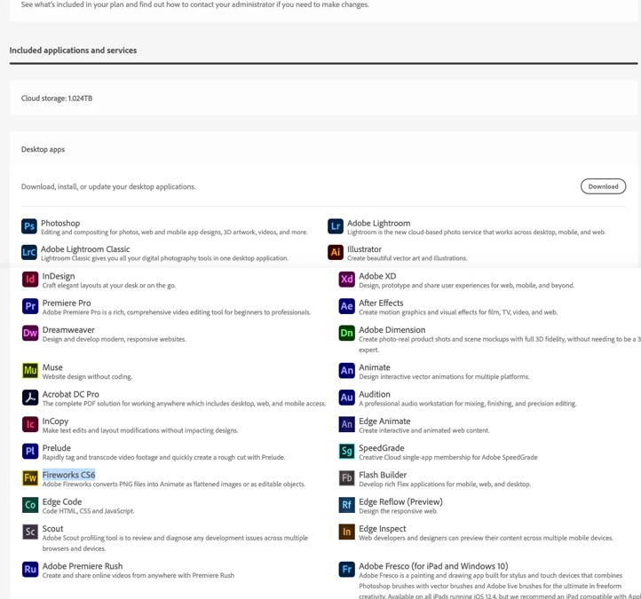 I have an enterprise adobe account with access to the full adobe suite. I was upgrading my creative cloud apps and saw that there were multiple versions of adobe apps installed: CS6, CC, CC2015, CC2018, and CC2020. I only wanted the latest version of the CC 2020 apps. When I went through and was uninstalling previous versions - not all versions were appearing in the list of apps in Creative cloud (I could see them in my list of applications on my mac though). So I downloaded the AdobeCreativeCloudCleanerTool to help me remove some of those old versions that weren't appearing in the list of apps. This appeared to have worked for most of the old apps - except that it also deleted fireworks on me and I didn't want to delete that. When I open the Creative Cloud app on my desktop and click All Apps - fireworks is missing with no way for me to download it. However when I look at the list of available apps to me in my plan on the adobe website I can see that fireworks is on the list. How do I get it back?