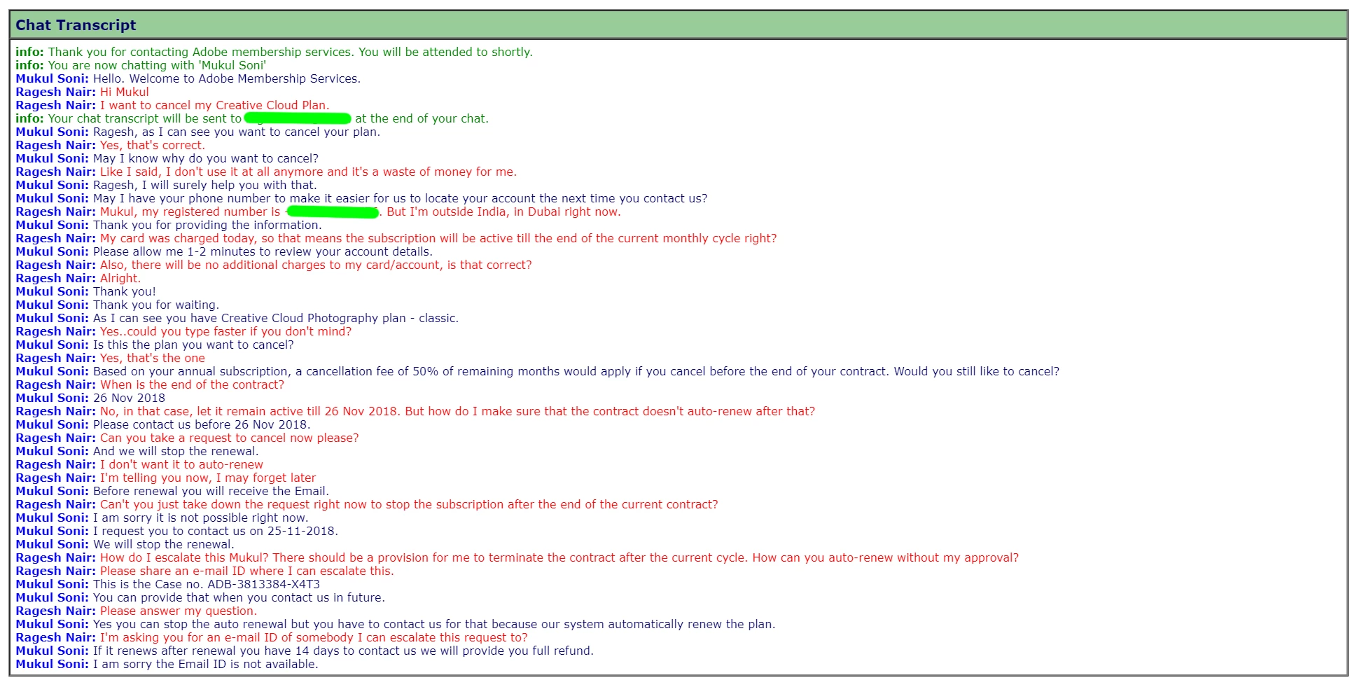I was chatting with customer support and I told them that I want to cancel my subscription. They said that I'll be charged 50% of the remaining monthly fee for the rest of my contract period. Apparently my contract expires on the 26th of November - but there's no record of this anywhere when I login to my account. They said I'll be notified before my contract auto-renews, but i went back and checked my e-mails and I haven't received any such mails from them in the past. What's even funnier is that as per records, I bought the current subscription in Jan 2017, and I never received any email saying that my plan would be auto-renewed. Also, how is it then my one year contract period ends in November?