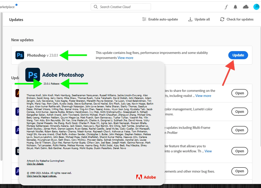 Today it sticks, meaning that the CC app still urges me to update Photoshop 23.0.1 to 23.0.1.