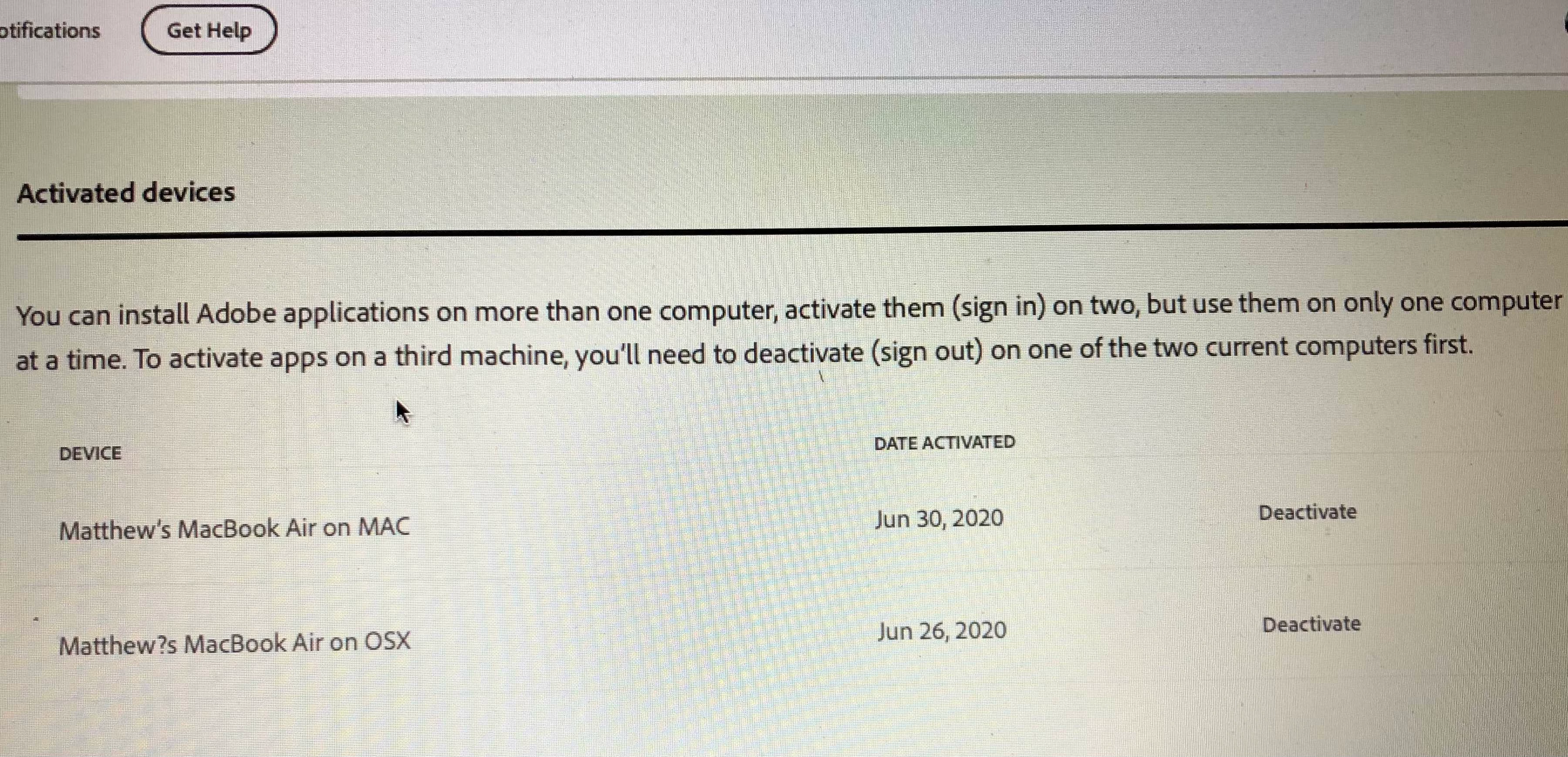 My Adobe CC account says I have 2 devices activated, both say a Macbook Air (i only have 1 Air), both say they were activated within 4 days of each other from back in June 2020 (i've had an Adobe CC account for years). One says 'MacBook Air on MAC', the other says 'MacBook Air on OSX'.
