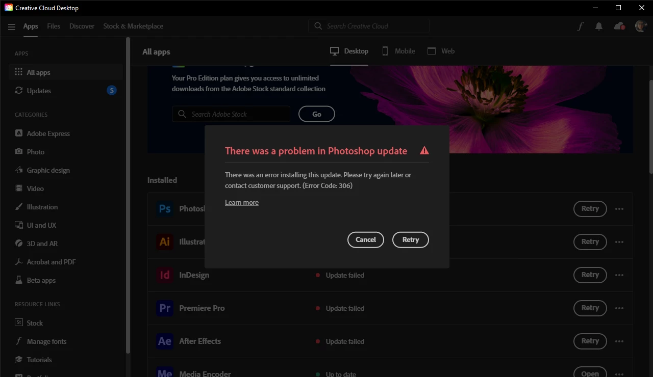 Error 306 indicates that you don't have the recent version of your Creative Cloud Desktop Client installed.