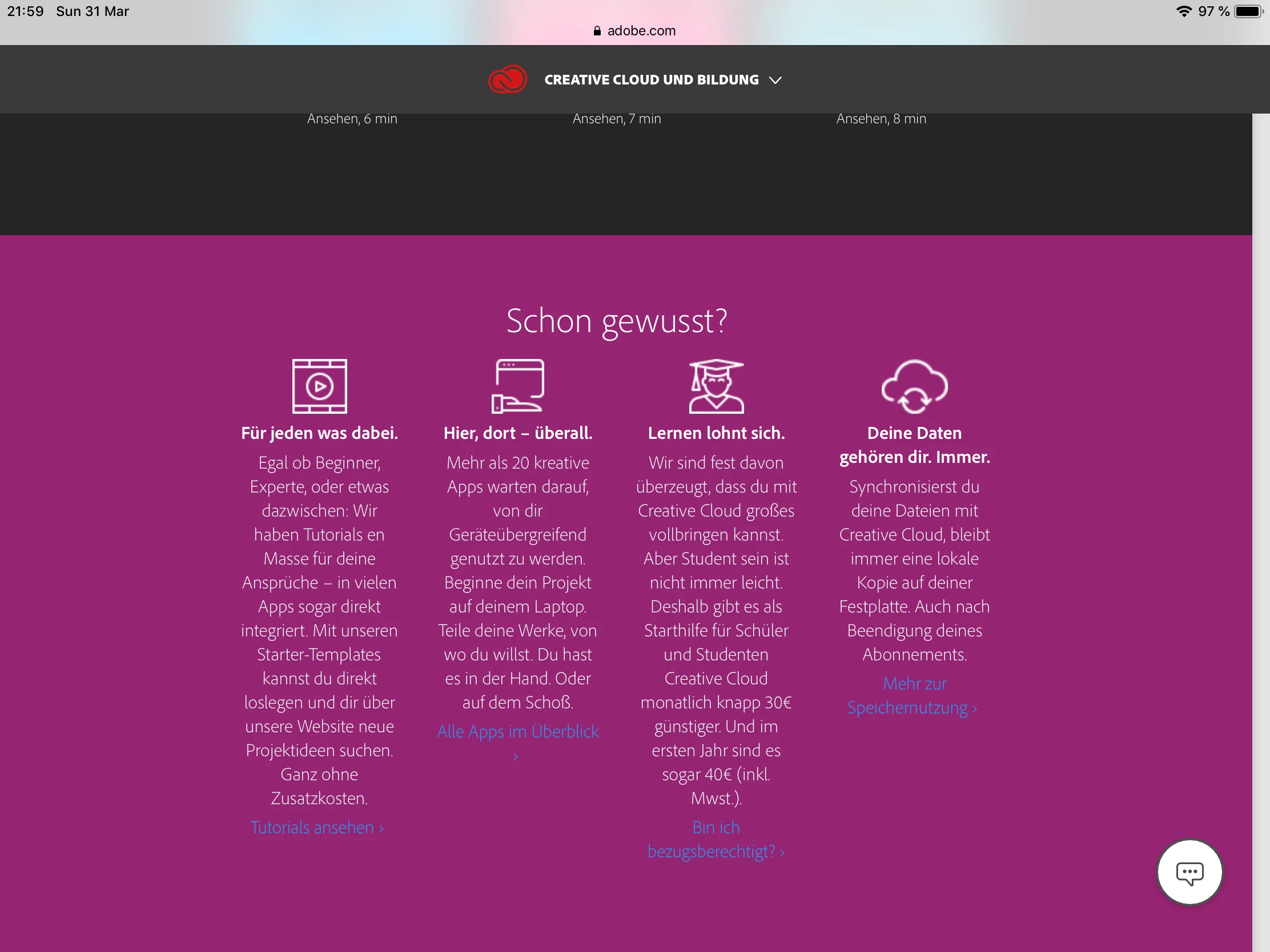 Einführungsangebot: Creative Cloud für € 19,34 pro Monat (65 % günstiger als das reguläre Abo) Einführungsangebot: Creative Cloud für € 19,34 pro Monat (65 % günstiger als das reguläre Abo) Schüler und Studierende ab 13 Jahren sowie Lehrkräfte und Dozenten erhalten das Jahres-Abo für die Adobe® Creative Cloud™ zum Preis von € 19,34 pro Monat im ersten Jahr. Danach verlängert sich das Abo automatisch für ein weiteres Jahr zum dann geltenden regulären Abo-Preis (derzeit € 29,74 pro Monat), es sei denn, Sie kündigen das Jahres-Abo vor dessen Ablauf. Das Angebot gilt für Bestellungen von Jahres-Abos mit einer Laufzeit von 12 Monaten. Der Einführungspreis gilt nur für neue Abonnenten, die die Kriterien der Bezugsberechtigung erfüllen und das Abo online im Adobe Store oder telefonisch über den Adobe-Direktvertrieb erwerben. Das Angebot gilt nicht für Unternehmen und Organisationen, OEMs und Teilnehmer an Adobes Lizenzprogrammen. Das Angebot ist auf eine (1) Bestellung pro Kunde für ein (1) Creative Cloud-Jahres-Abo beschränkt. Es kann nicht abgetreten, verkauft, übertragen oder mit anderen Rabatten oder Angeboten kombiniert werden. Das Angebot kann nicht gegen Bargeld oder andere Produkte bzw. Dienstleistungen eingelöst werden. Änderungen vorbehalten. Das Angebot gilt unter der Voraussetzung, dass es weder nichtig noch durch geltende Gesetze eingeschränkt ist. |