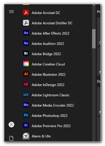 Win10, Adobe CC start menu: fix missing and old program shortcuts