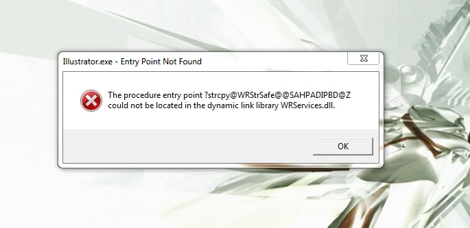 It looks like one of the .dll files Illustrator uses on start up has gotten lost or corrupted. You could try using Microsoft's System File Checker to repair it: https://support.microsoft.com/en-us/kb/929833. You might also check the solutions offered on the following forum discussion about a related issue (different .dll, but same basic message): Illustrator CS6 won't run. Entry Point Not Found. Users have apparently had some success solving the problem by updating drivers, manually deleting corrupt files, or restoring previous file versions.
