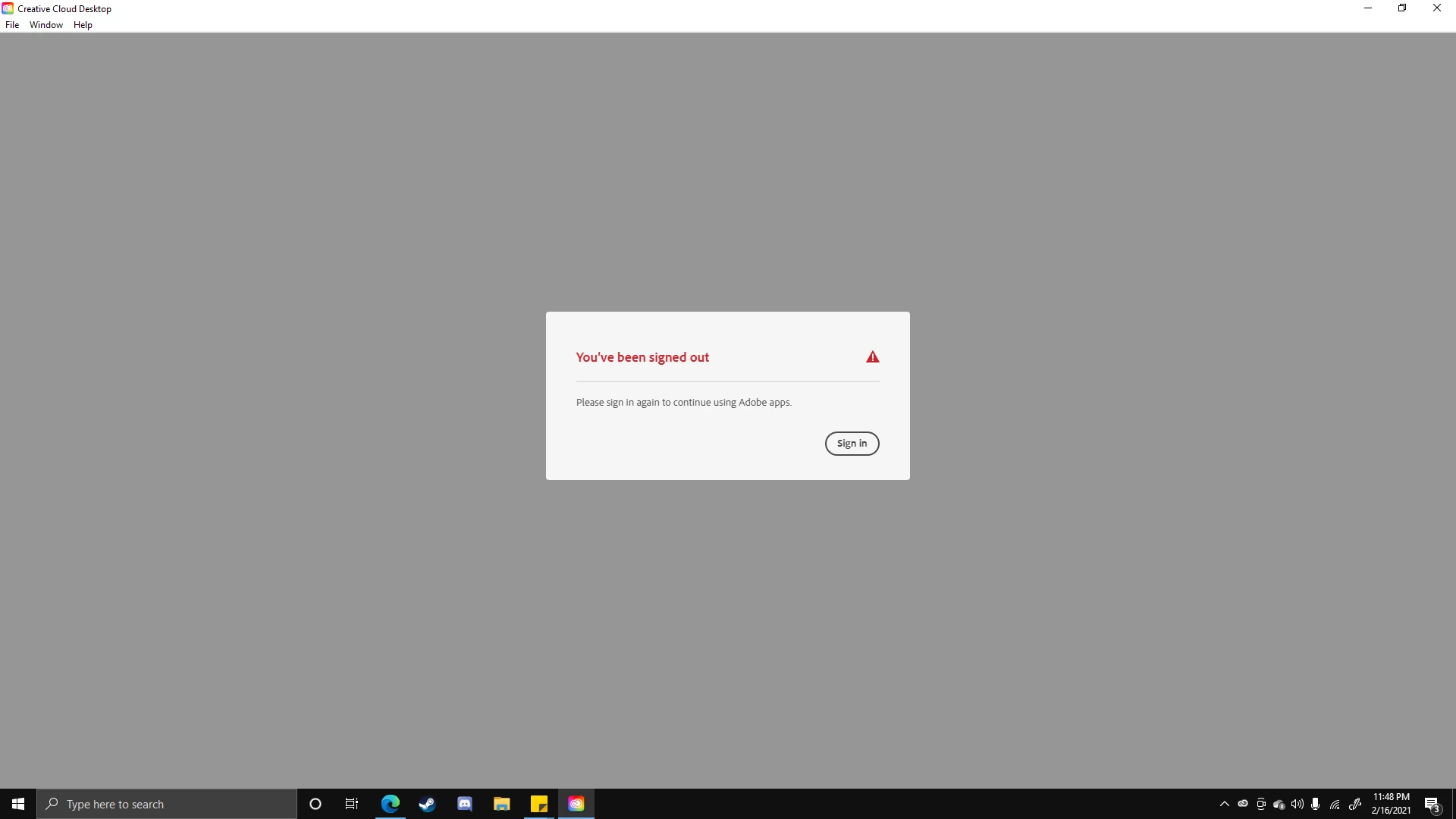 Hello, right now on my main computer adobe creative cloud will either be constantly loading or it will say 'you have been signed out' with an option to sign in. However, pressing the sign in button just brings me back to the exact same page - it doesn't even let me enter my username or password.