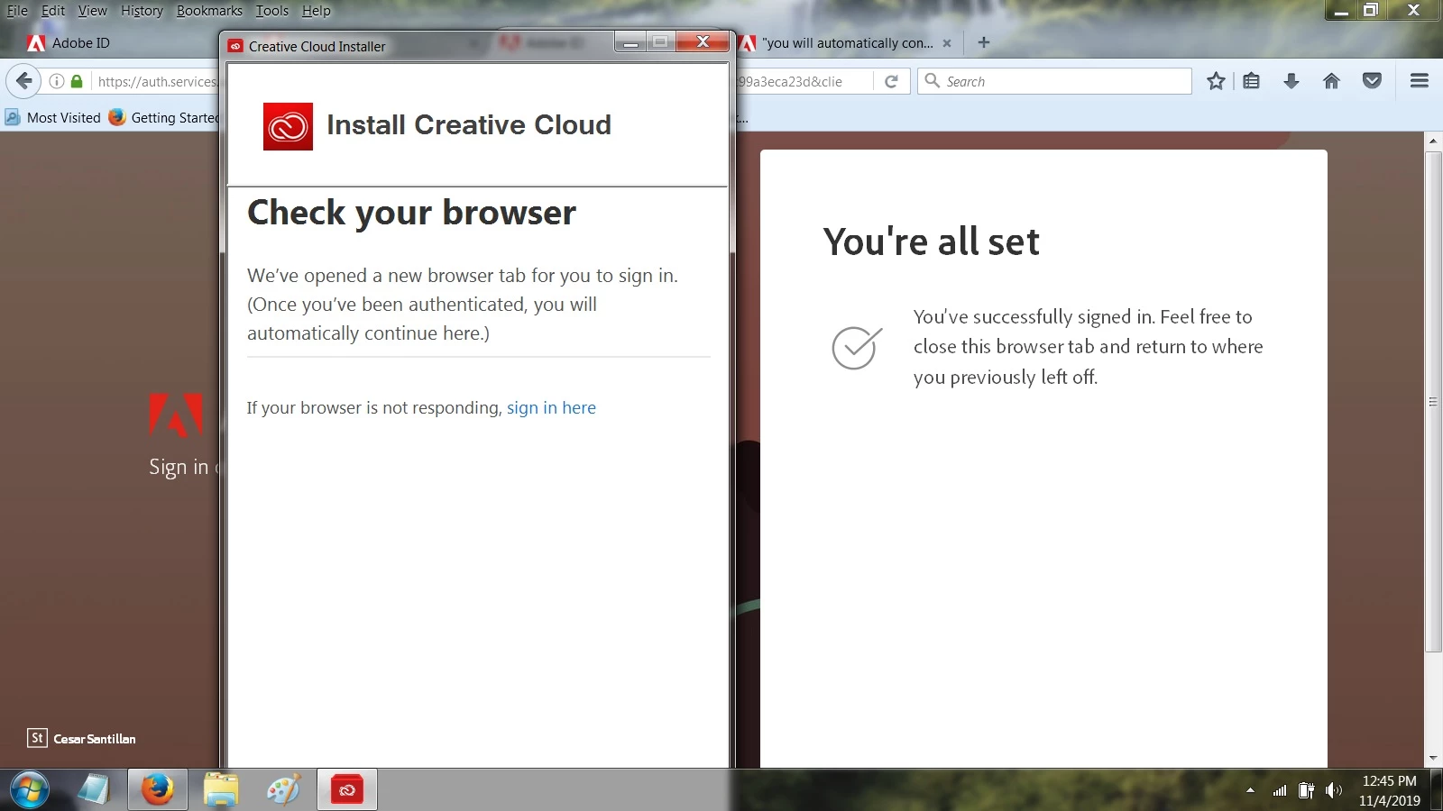 Install Creative cloud open a tab in my chrome browser to authenticate my account before continue install.