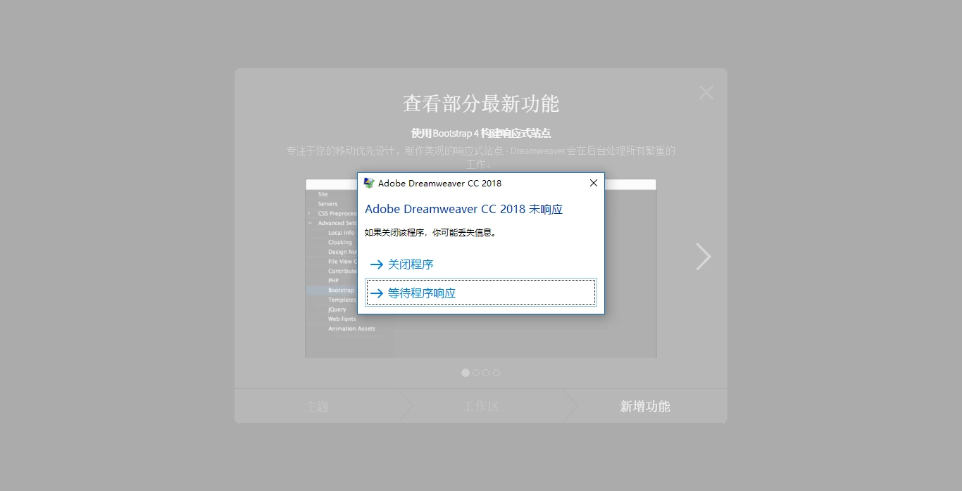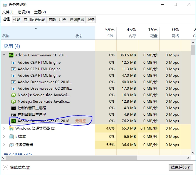 You can see,there are 10 processes of Dreamweaver,and only "Adobe Dreamweaver CC 2018.exe"has no respond.And every time this happened,if I don't end this program manually,it will continuously no respond,and would not close.