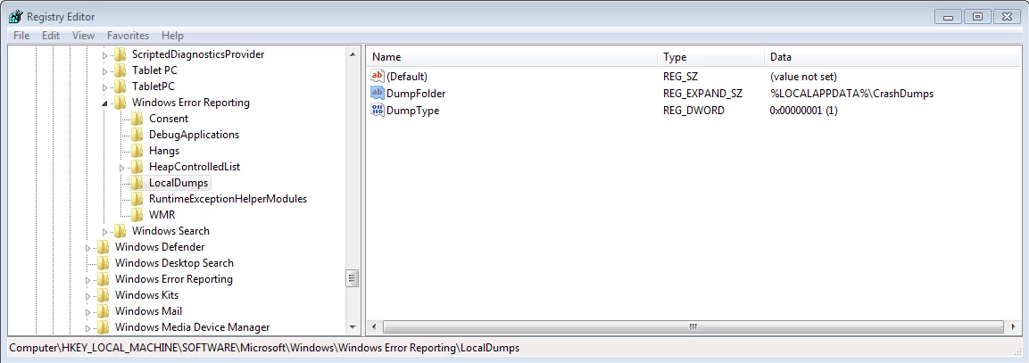 - Go to HKEY_LOCAL_MACHINE\SOFTWARE\Microsoft\Windows\Windows Error Reporting->Right Click->New->Key. New key named "New Key #1" will be created. Rename it to LocalDumps.