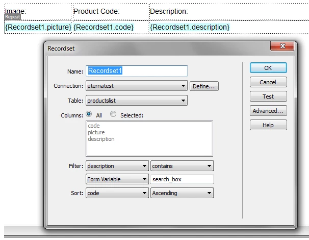 What I would ideally like though is to seperate the code and description columns (as shown below - pic 1), the problem is the search only works by finding the content in the description column, I have tried all different things in the "Advanced" tab to Filter by "Code" and "Description" but it is still only filtering by "Description" only.