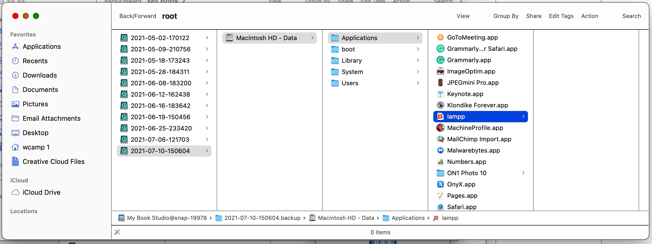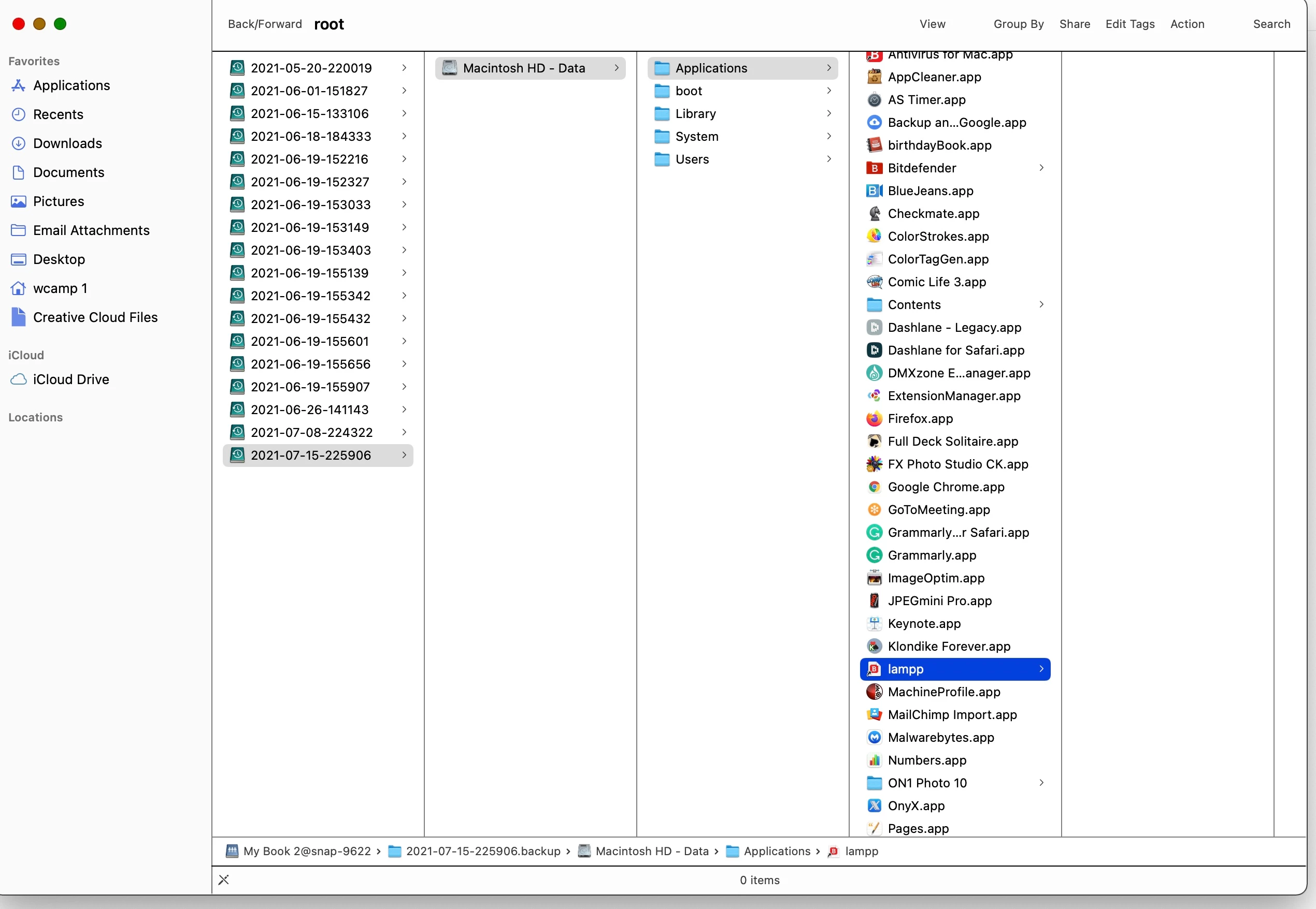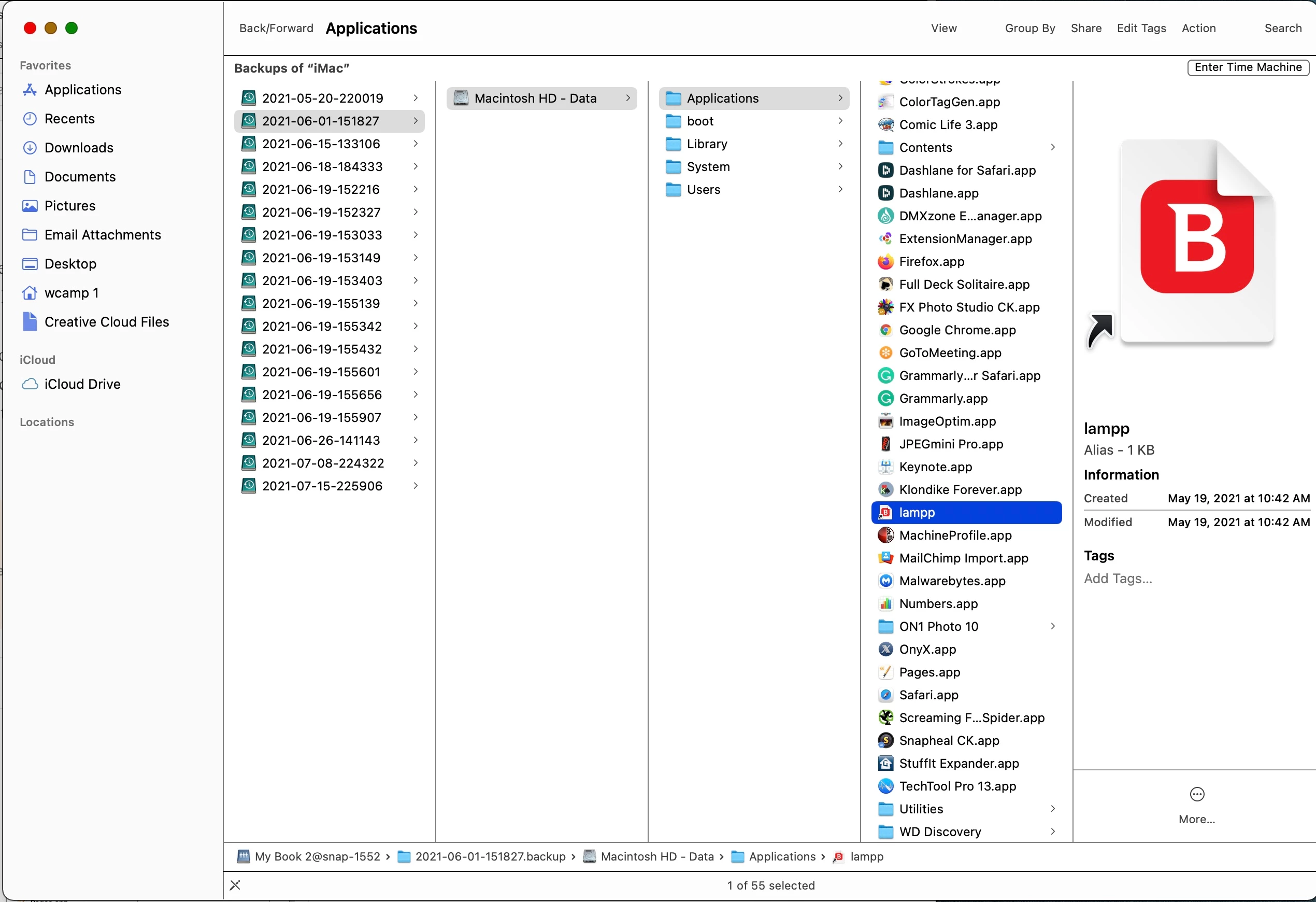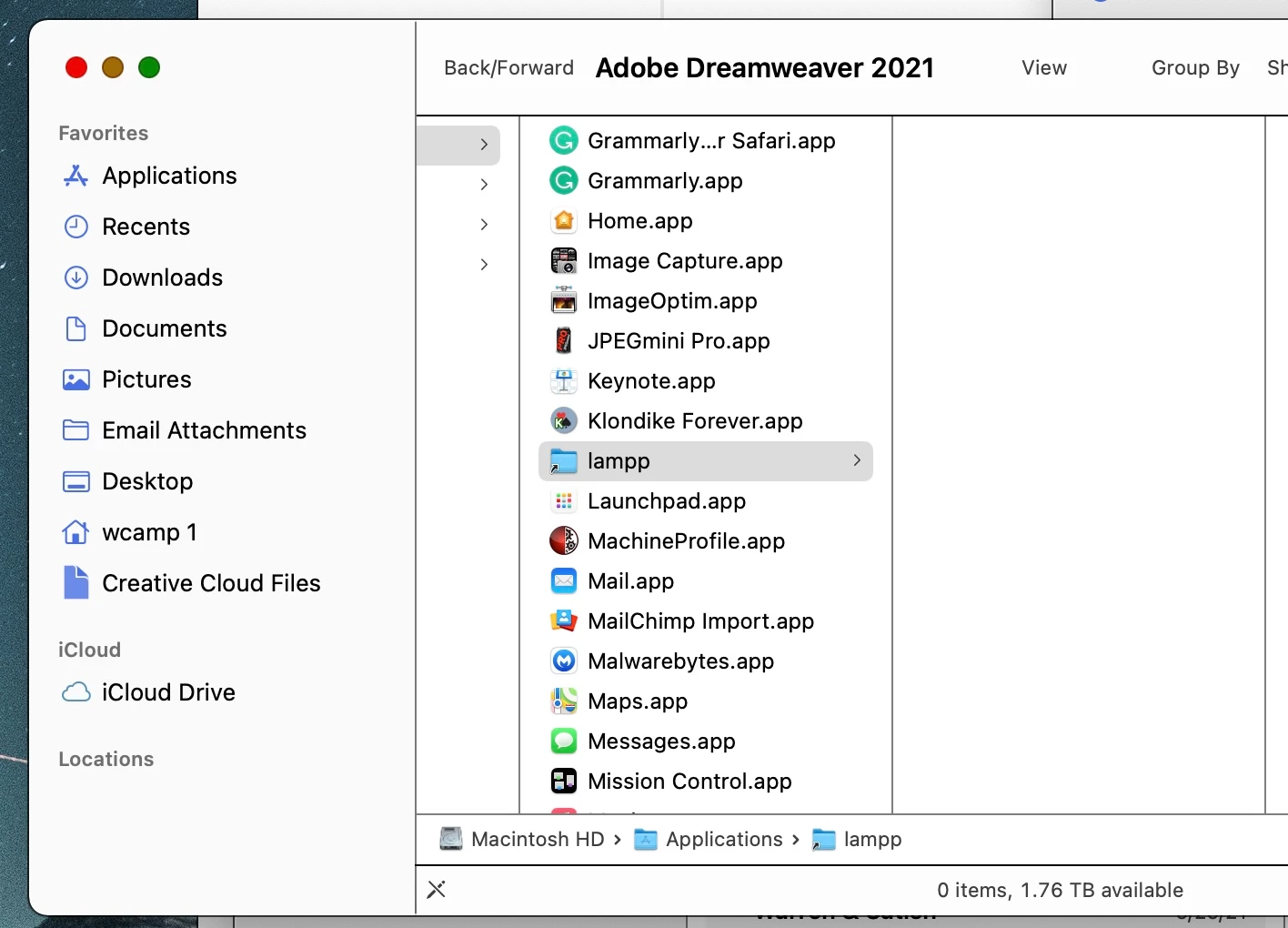 When I opened DW 21.1, none of my files appeared in the list of files. So I checked the "lampp" folder in my Applications folder. As my first screenshot reveals, the folder was empty.