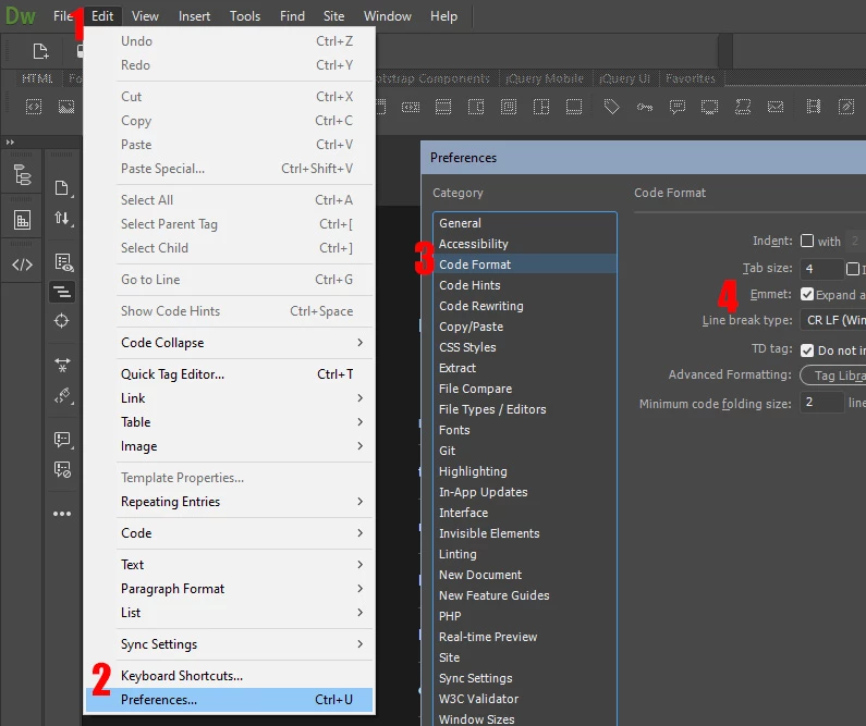 Je cherche a ACTIVER EMMET dans le panneau de PREFERENCES de DREAMWEAVER dernière édition