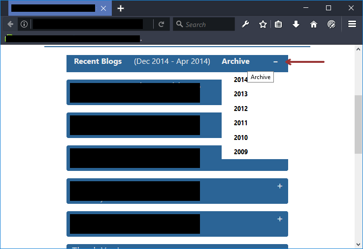 There is a header called "Archive" that has a plus sign on the right. When you click it, a div expands that shows years and the plus turns into a minus via jQuery.